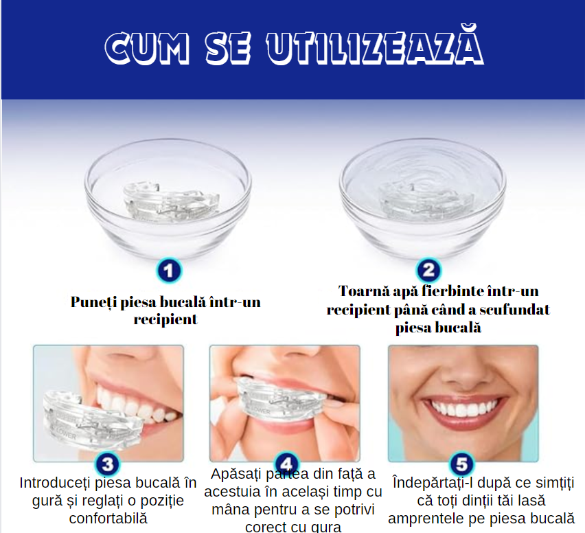 Gutiera ani-sforăit elimină apneea în somn la rădăcină prin poziționarea perfectă a maxilarului în care poate curge aerul. Cu acest dispozitiv vei dormi mai bine peste noapte!