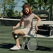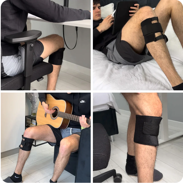 Această genunchieră nouă folosește o tehnologie de acupresiune patentată pentru a aplica o compresie ușoară și țintită într-un punct specific de pe mușchiul gambei, chiar sub genunchi.